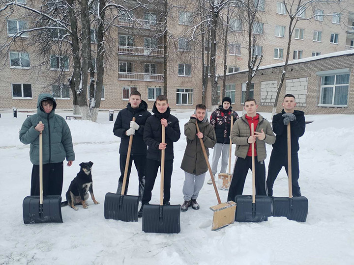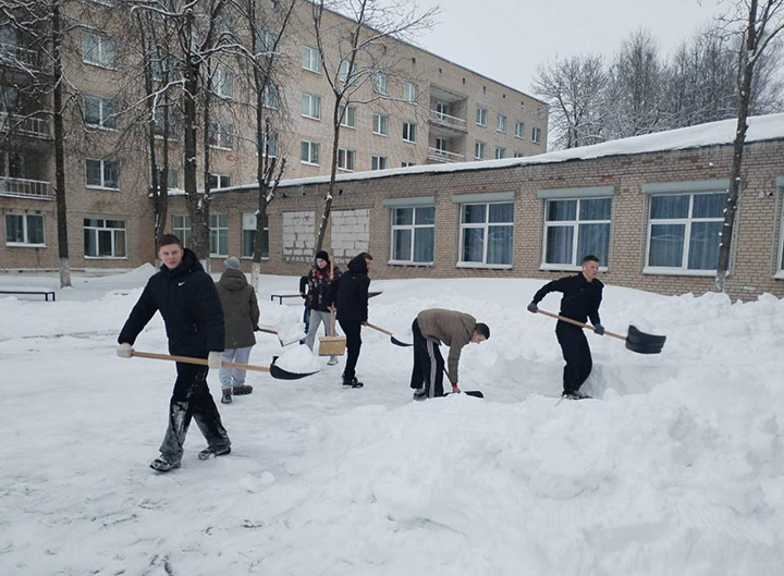 Волонтеры колледжа продовольствия под руководством мастера п/о Ракова А. А. дружно вышли на расчистку снега возле своего учреждения образования. Ребята почистили дорожки и территорию возле колледжа.